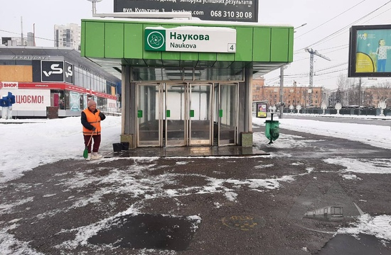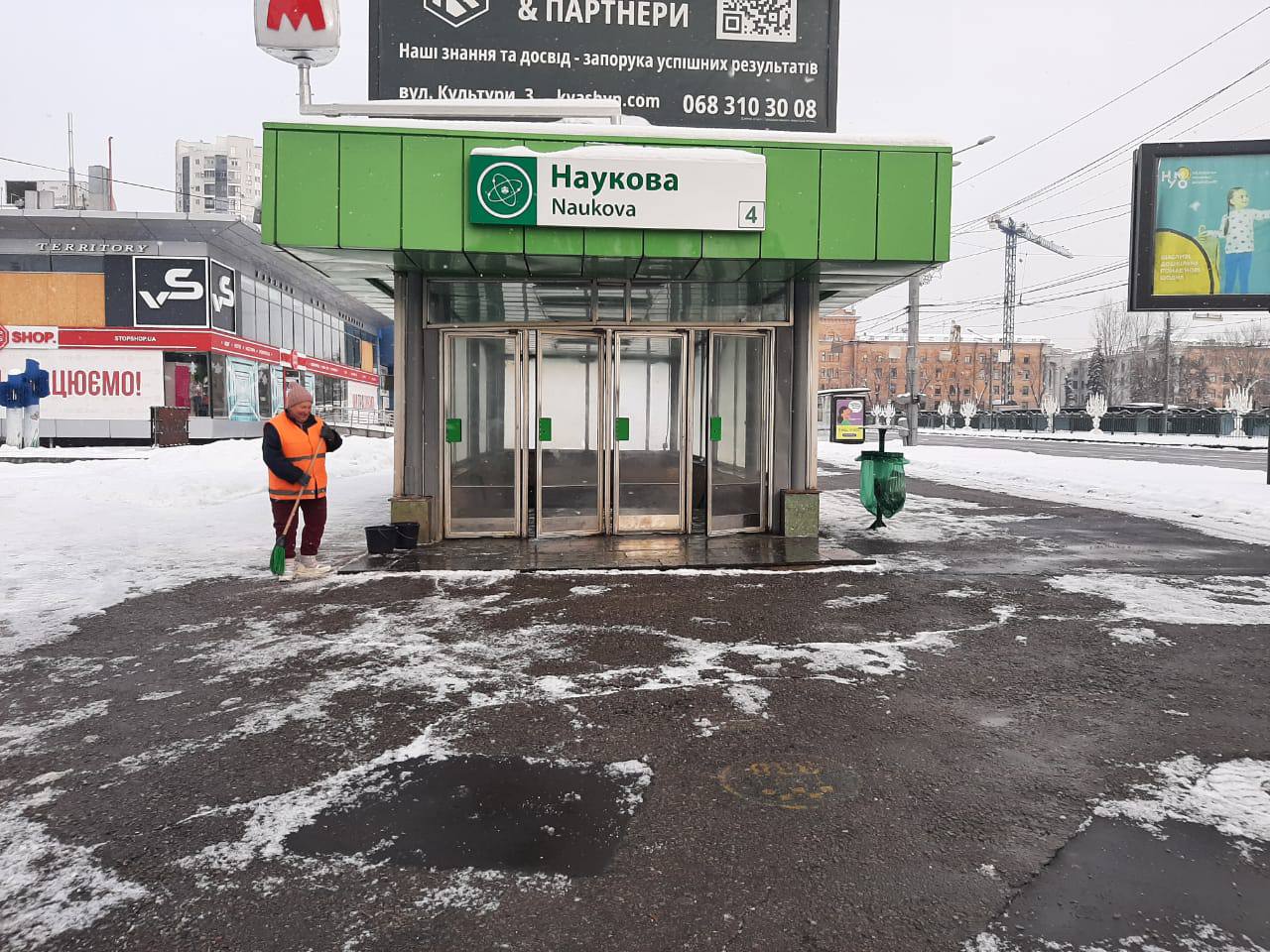1 січня співробітники КП «Харківський метрополітен» проводять роботи з прибирання снігу в Харкові. 130 працівників очищають території біля входів до підземних переходів станцій метро та обробляють їх піщано-сольовою сумішшю.