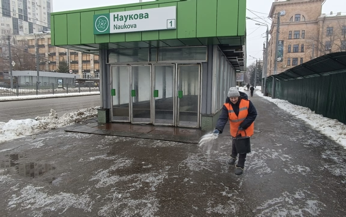 Робітники комунального підприємства «Харківський метрополітен» прибирають лід та посипають піщано-сольовою сумішшю прилеглу територію біля входів до підземних переходів станцій метрополітену.